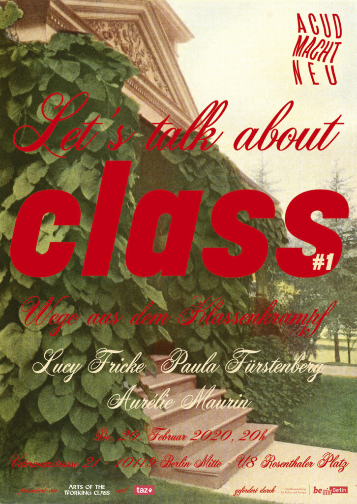 Deutschland ist eine Klassengesellschaft, die so tut, als wäre sie keine. Das macht sie besonders undurchlässig. Darüber zu reden, wie soziale Herkunft Lebenswege bestimmt, ist fast ein Tabu. Diese Scham wollen wir überwinden: Die Lese-Performance-Gesprächsreihe LET’S TALK ABOUT CLASS bahnt Wege aus dem Klassenkrampf. Zum Auftakt sind am 20. Februar 2020 die Autorinnen Lucy Fricke und Paula Fürstenberg zu Gast. Aurélie Maurin macht Musik.